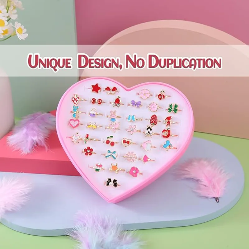 ภายในกล่องมีแหวนเครื่องประดับโลหะผสมสาวน่ารัก 36 วง แหวนทั้งหมดนี้มีสีสันและน่ารัก มีลวดลายต่างๆ เช่น กระต่ายสีขาว สตรอเบอร์รี่ ดอกไม้ นกฮูก ดาว เต่า ลูกแมว คันธนู แอปเปิ้ล เชอร์รี่ ผีเสื้อ เห็ด ยูนิคอร์น โคลเวอร์ ฯลฯ เป็นของขวัญที่ดีสำหรับเจ้าหญิงที่คุณรัก