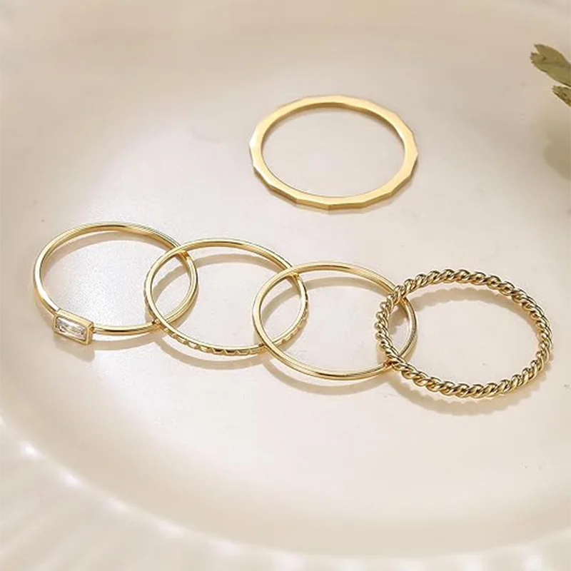 แหวนผู้หญิงวางซ้อนกันได้เรียบง่าย - แสดงสไตล์ของคุณ - เซตแหวนทองคำและเงินชุดนี้ประกอบด้วยแหวนบางเฉียบและสวยงามจำนวน 5 วง พร้อมสไตล์ที่หลากหลายและดีไซน์เรียบง่าย เมื่อสวมใส่เพียงตัวเดียวก็สามารถสร้างรูปลักษณ์ที่หรูหราและเรียบง่าย หรือจะใส่คู่กันเพื่อแสดงสไตล์ที่โดดเด่นก็ได้ เหมาะสำหรับวางซ้อน ผสมและจับคู่ และจัดแต่งทรงผม!
