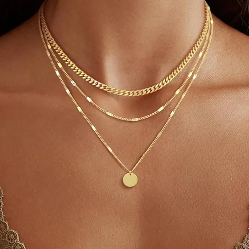 สร้อยคอแฟชั่นผู้หญิงเคลือบทองสำหรับผู้หญิงประกอบด้วยสร้อยคอสามแบบที่แตกต่างกัน ได้แก่ โซ่คิวบา โซ่แหลม และโซ่เหรียญ ซึ่งสามารถสวมใส่แยกกันหรือซ้อนกันได้ โซ่คิวบาแบบสั้นขนาด 13.8 นิ้ว (กว้าง 5 มม.) เป็นแบบย้อนยุคและประณีต โซ่จี้ทรงแหลมขนาดกลาง 15 นิ้วนั้นเรียบง่ายและเรียบร้อย ส่วนโซ่แบบเหรียญแบบยาว 17 นิ้วนั้นใช้งานได้หลากหลายและหรูหรา ทั้งสามสไตล์เข้ากันได้อย่างลงตัว ให้ความรู้สึกถึงการซ้อนชั้นเมื่อวางซ้อนกัน และแต่ละสไตล์ก็มีเสน่ห์เป็นของตัวเองเมื่อสวมใส่เพียงลำพัง
