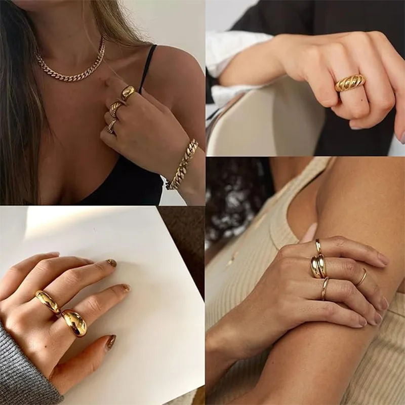 วัสดุปลอดสารก่อภูมิแพ้จากธรรมชาติทั้งหมด: แหวนหนาเกินจริงของเราทำจากทองเหลืองและชุบด้วยทอง 18K ไม่มีสารตะกั่วหรือนิกเกิลและไม่เป็นอันตรายต่อร่างกายของคุณ สีติดทนนานและสวมใส่สบายเป็นเวลานาน พื้นผิวมีความมันเงาสูงและไม่ต้องกังวลว่าจะเกานิ้ว